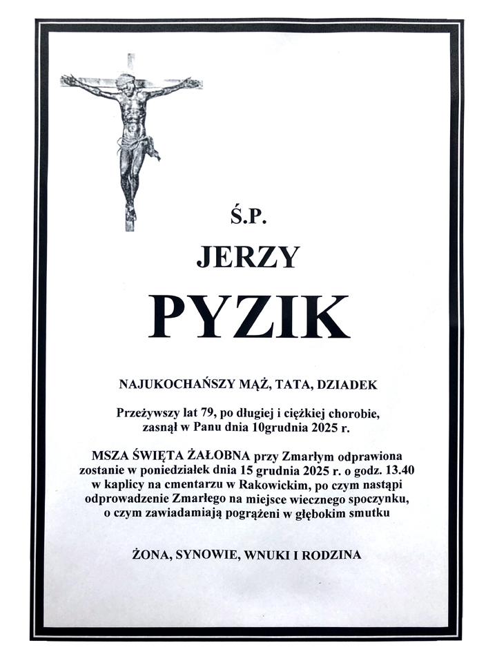 Msza Święta Żałobna przy Zmarłym odprawiona zostanie w poniedziałek 15 grudnia o godzinie 13.40 w kaplicy na Cmentarzu Rakowickim, po czym nastąpi odprowadzenie Zmarłego na miejsce wiecznego spoczynku.