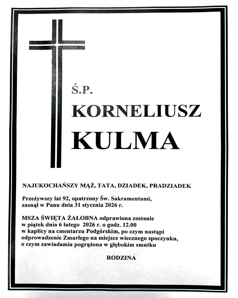 Msza Święta Żałobna przy Zmarłym odprawiona zostanie w piątek 6 lutego o godzinie 12.00 w kaplicy na Cmentarzu Podgórskim, po czym nastąpi odprowadzenie Zmarłego na miejsce wiecznego spoczynku.